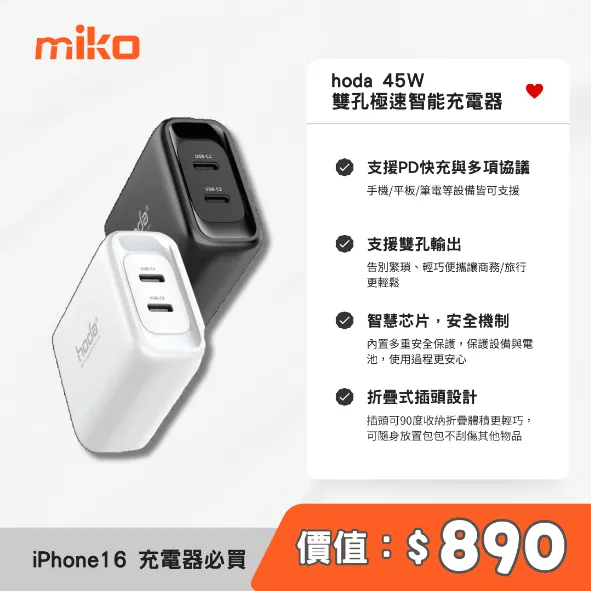 🎁獨家好禮3:Hoda 45W快速充電器(價值$890)