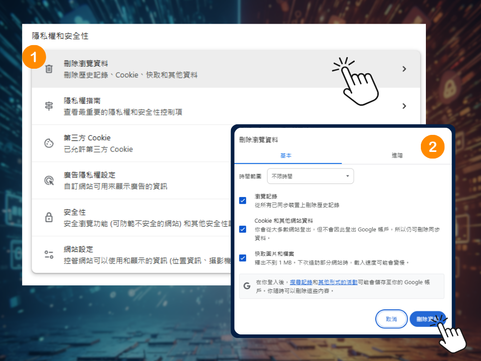 選擇「Cookie 與網站資料」與「快取圖片和檔案」