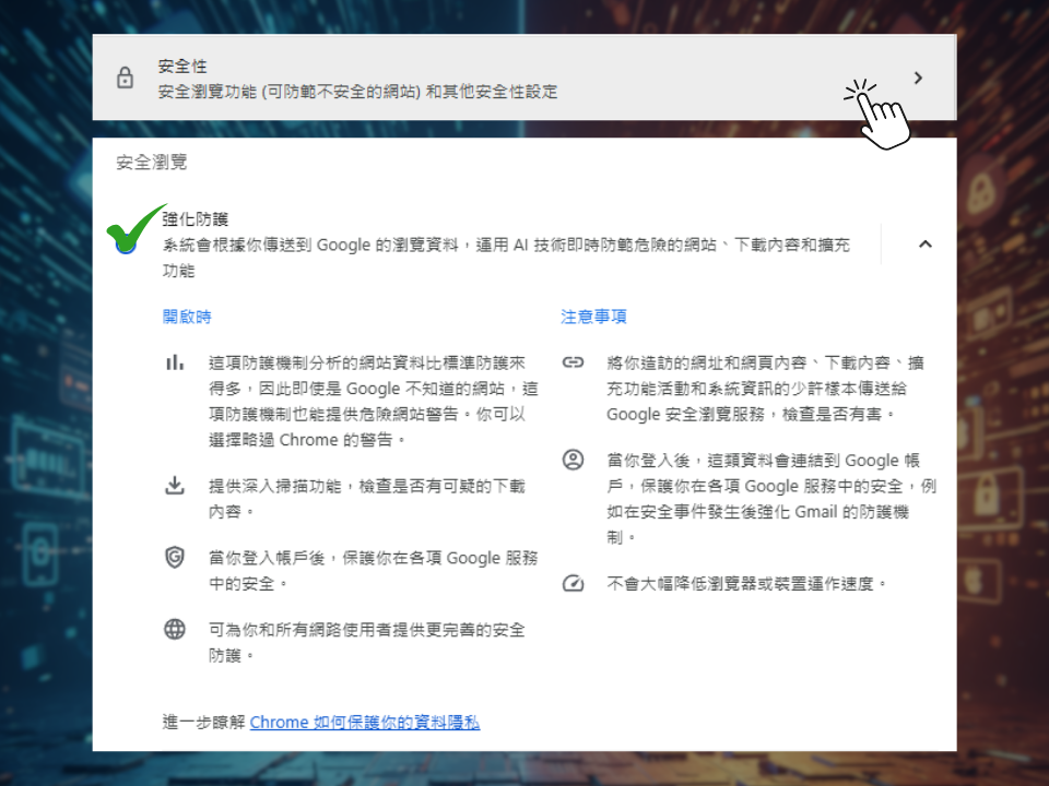打開【 開啟 Chrome → 點擊右下角「⋯」中的設定 → 隱私權與安全性 → 安全性 → 安全瀏覽 → 選擇「強化防護」 】